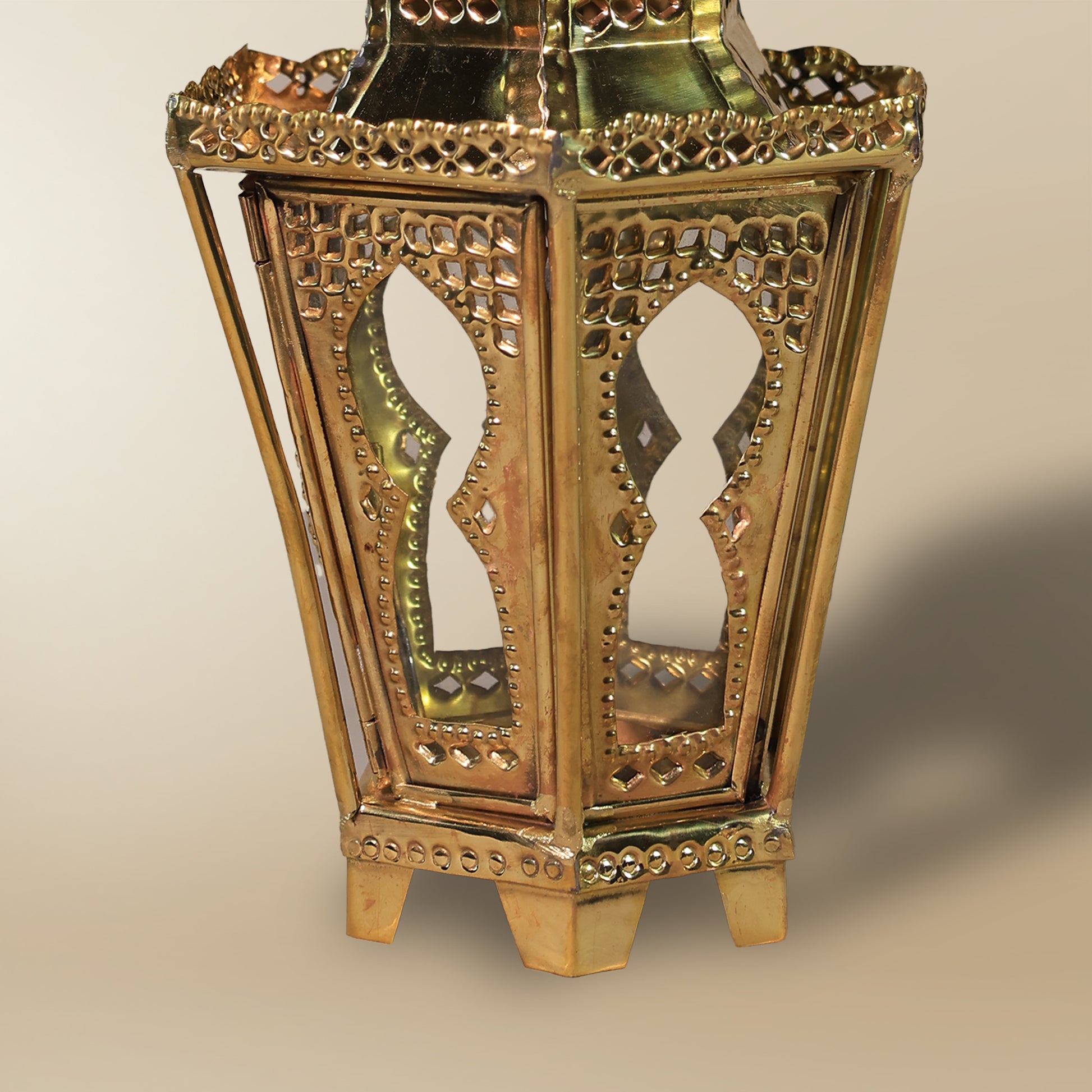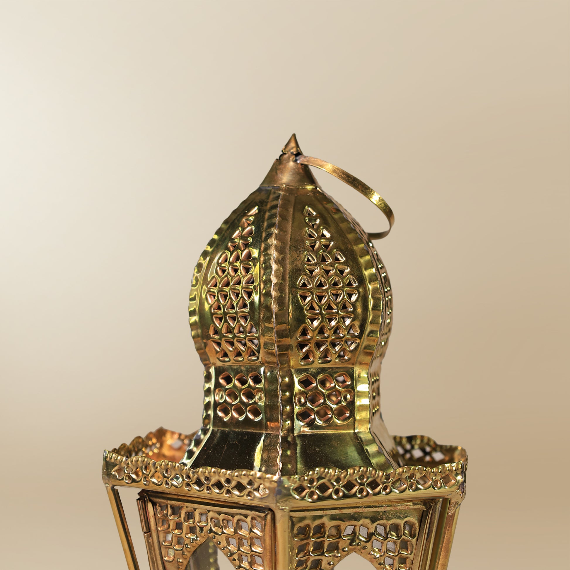 يُذكّر فانوس المئذنة الذهبية، المصنوع يدويًا من النحاس بنقوش دقيقة، بتوهج الأسواق القديمة وليالي رمضان، حين كان نوره يُنير التجمعات والصلوات. تُلقي قمته المُقببة ونوافذه الشبكية أنماطًا ساحرة من الظلال واللهب، مُحوّلةً أي زاوية إلى مشهدٍ دافئٍ وعريق.