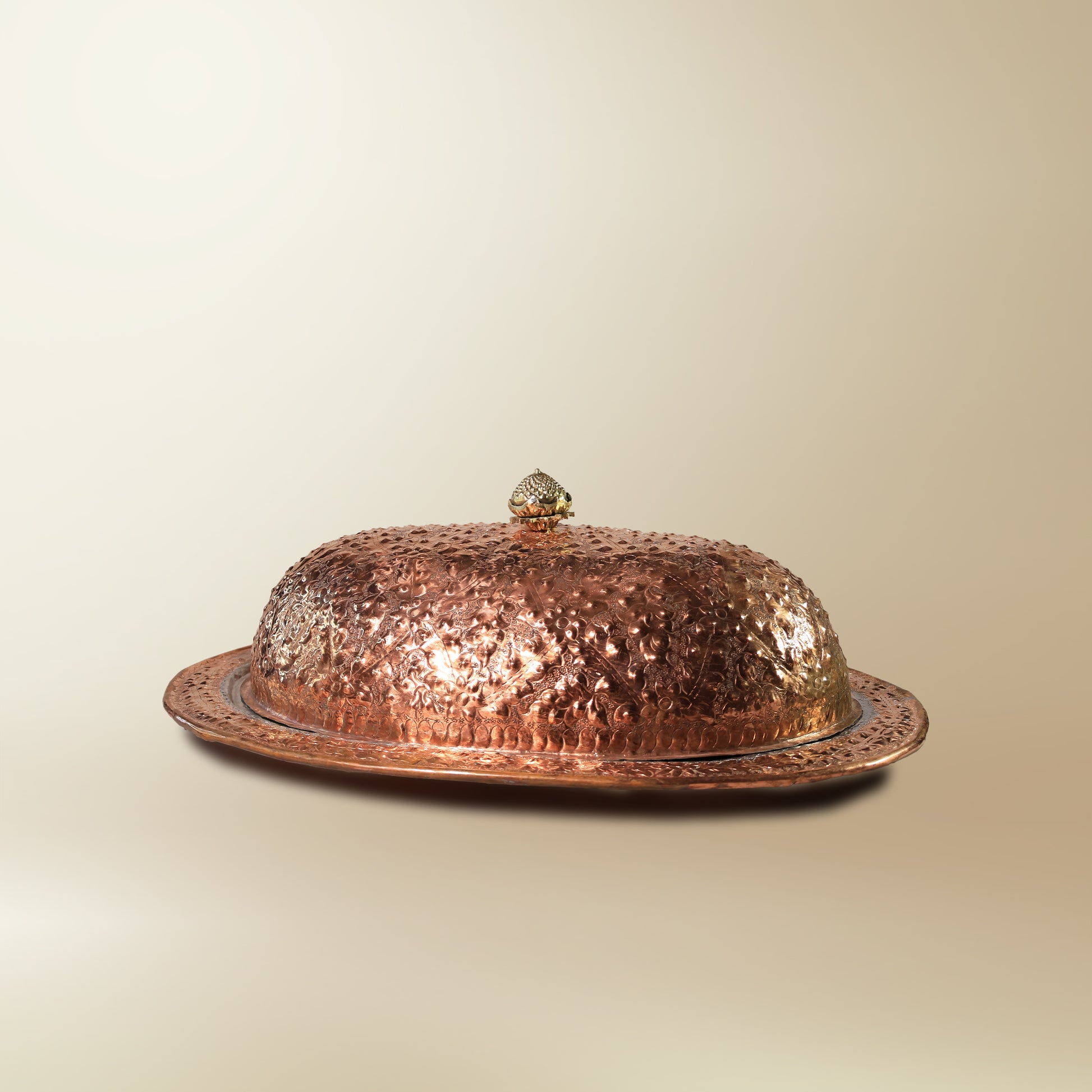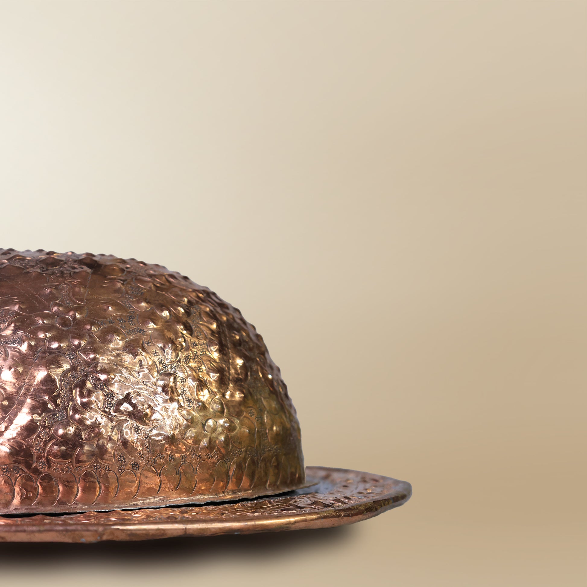 هذه الصينية المغطاة بقبة، المصنوعة يدويًا من النحاس المطروق، تُذكّر بفخامة الولائم الملكية والعائلية في بيوت الشرق الأوسط القديمة. غطاؤها المُفصّل، المُتوّج بزخرفة نهائية، كان يُحافظ على دفء الأطباق ويُضفي لمسةً من الأناقة على المائدة.