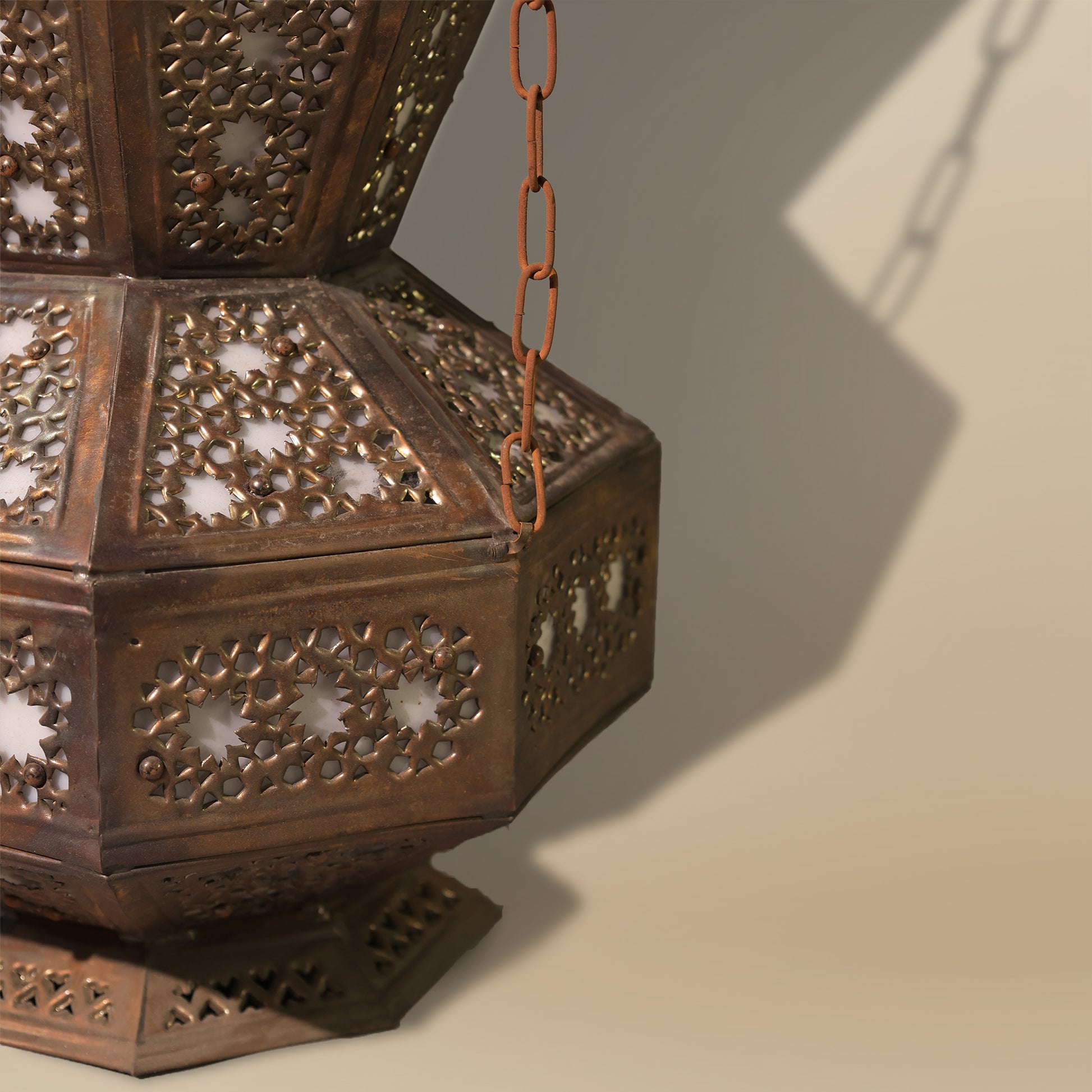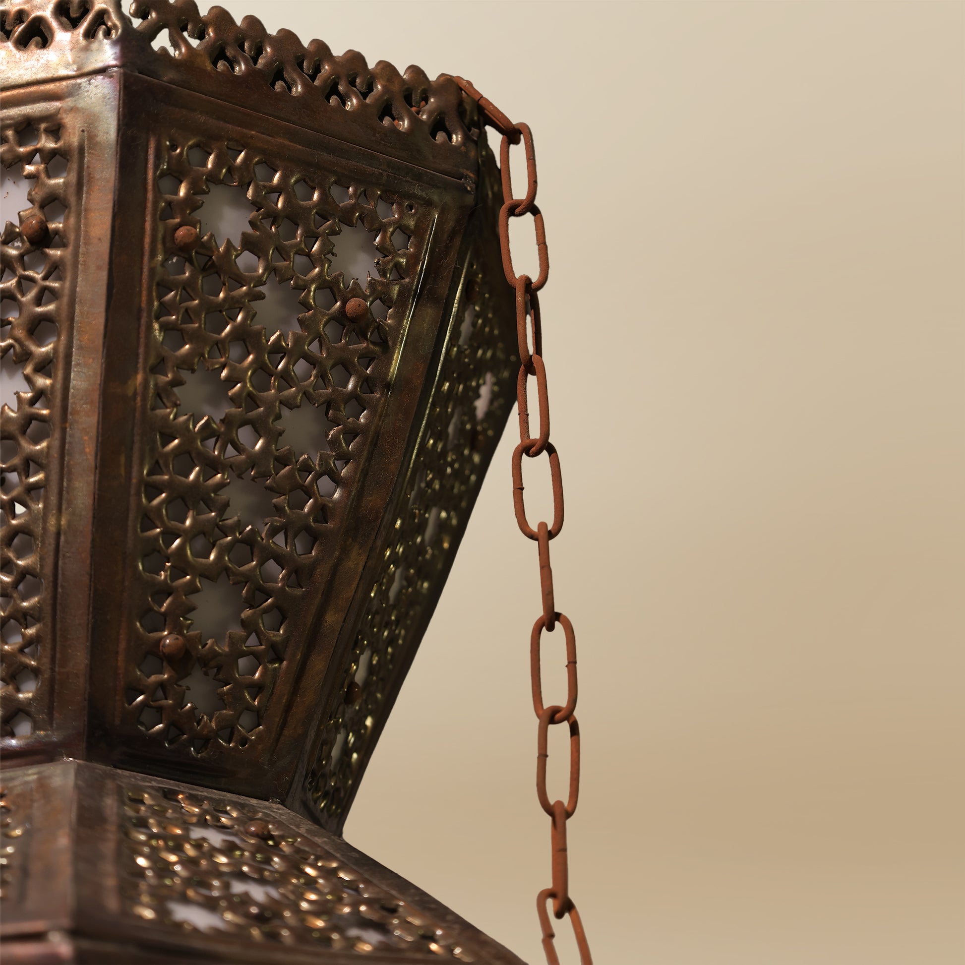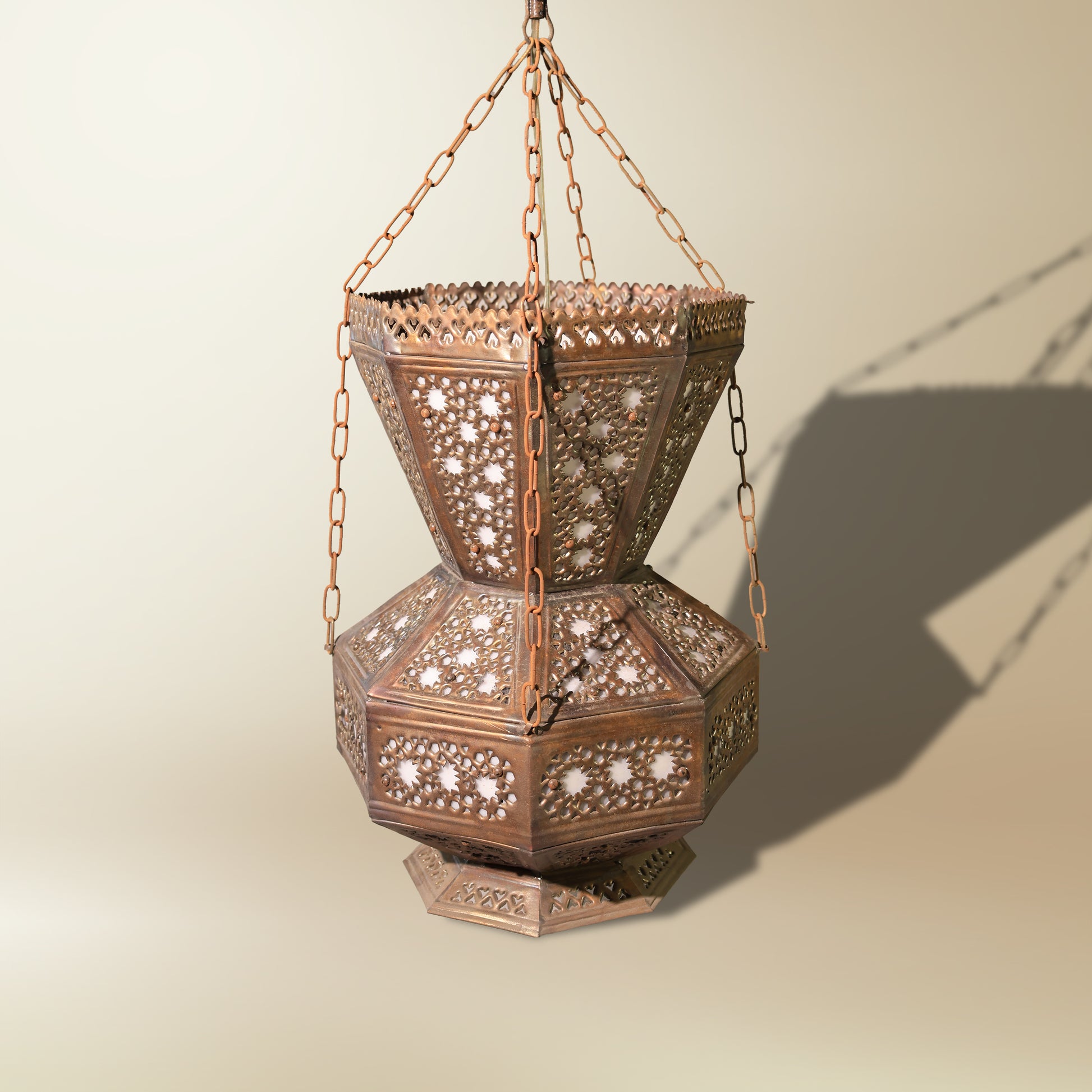هذا الفانوس، المصنوع يدويًا من النحاس الخالص، يحمل روح الأسواق القديمة والساحات المُضاءة بنور القمر. تُشتت فتحاته الهندسية المُعقدة الضوء في أنماط نجمية الشكل، مُحوّلةً كل زاوية إلى نسيج من الظلال والتوهج.