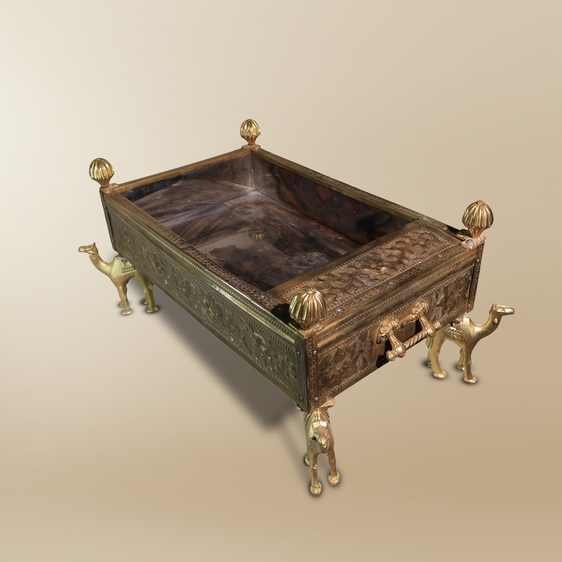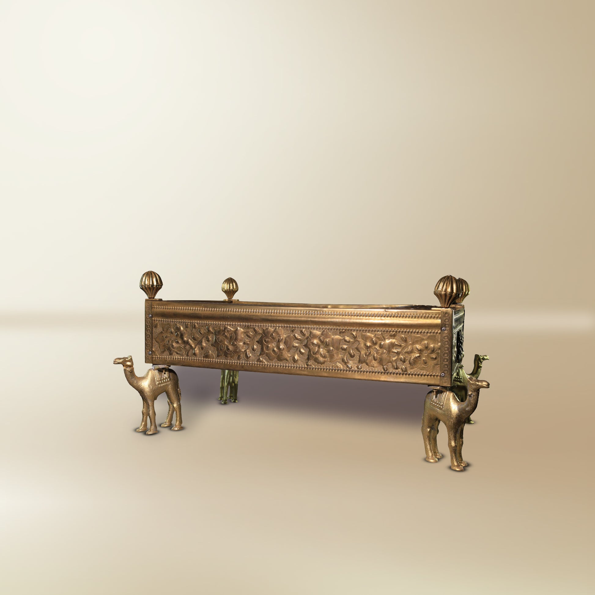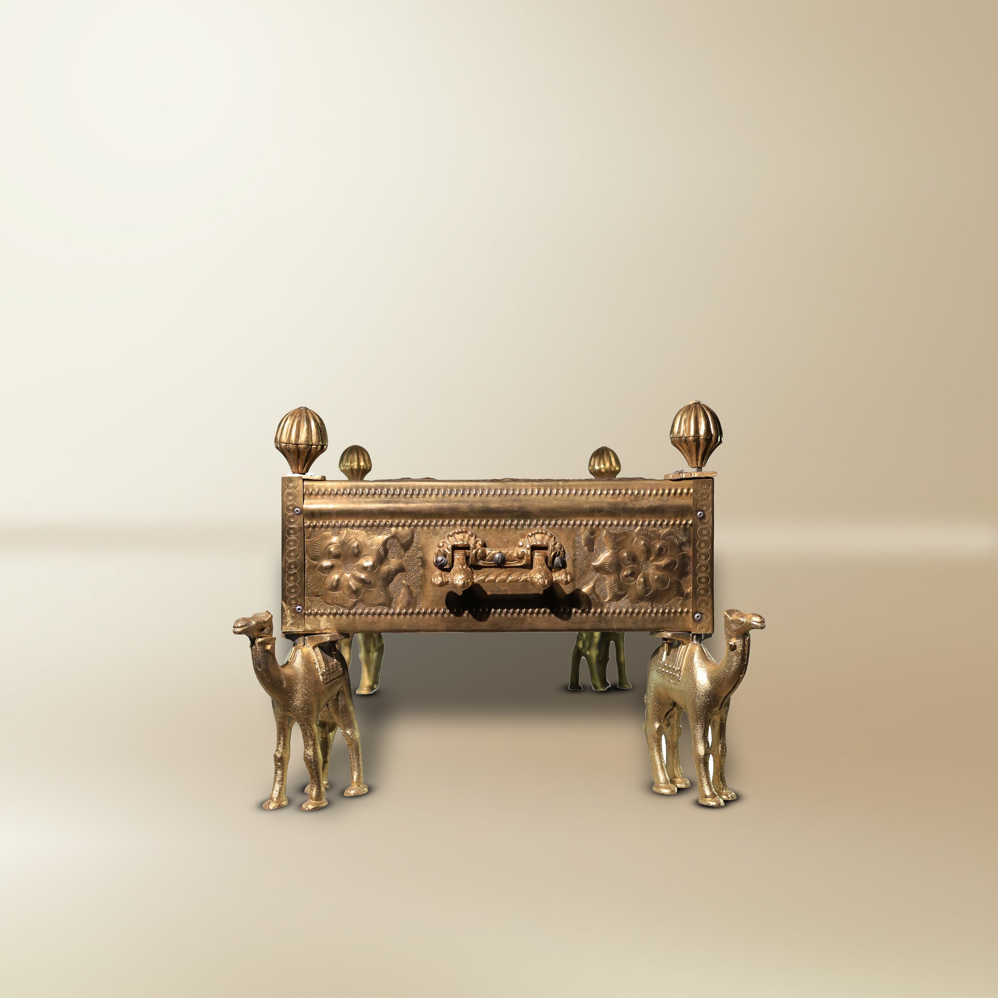 رمزية. مصنوع من النحاس الخالص، يقف بفخر على أرجل جمال منحوتة - تكريمًا للقوافل التي كانت تحمل الكنوز عبر الصحاري العربية. تُثري النقوش الزهرية الرقيقة ألواحه، بينما تُتوّج كل زاوية بزخارف مقببة، مما يمنحه حضورًا ملكيًا يليق بالفلل والفنادق والمجموعات الخاصة.