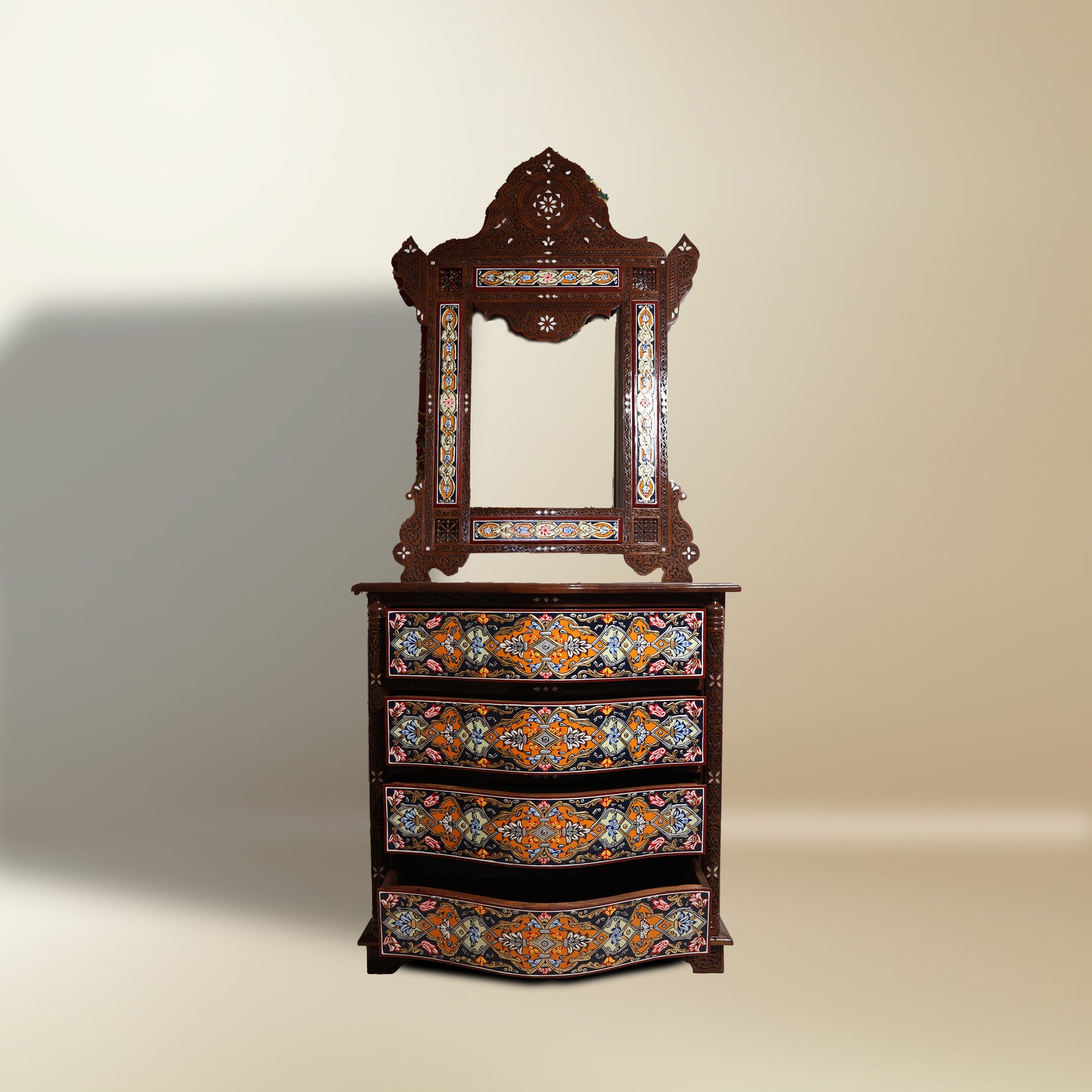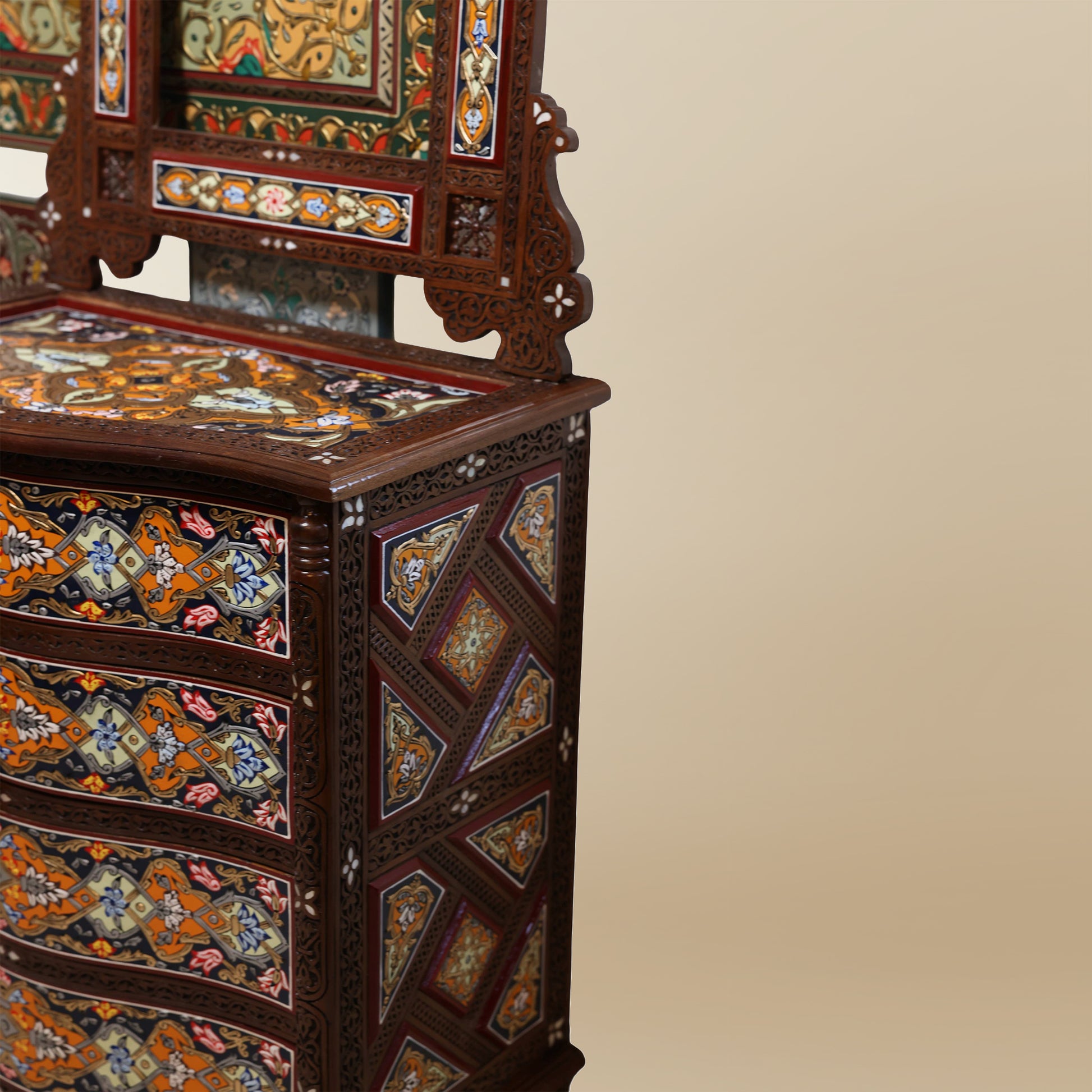 انعكاس الوزير تحفة فنية دمشقية ملكية، تجمع بين الوظيفة والفخامة. أدراج الكونسول المنحنية وإطار المرآة، المزخرفة يدويًا بزخارف عربية زاهية وزخارف نباتية، تتألق ببراعة الحرف اليدوية الشامية الخالدة.