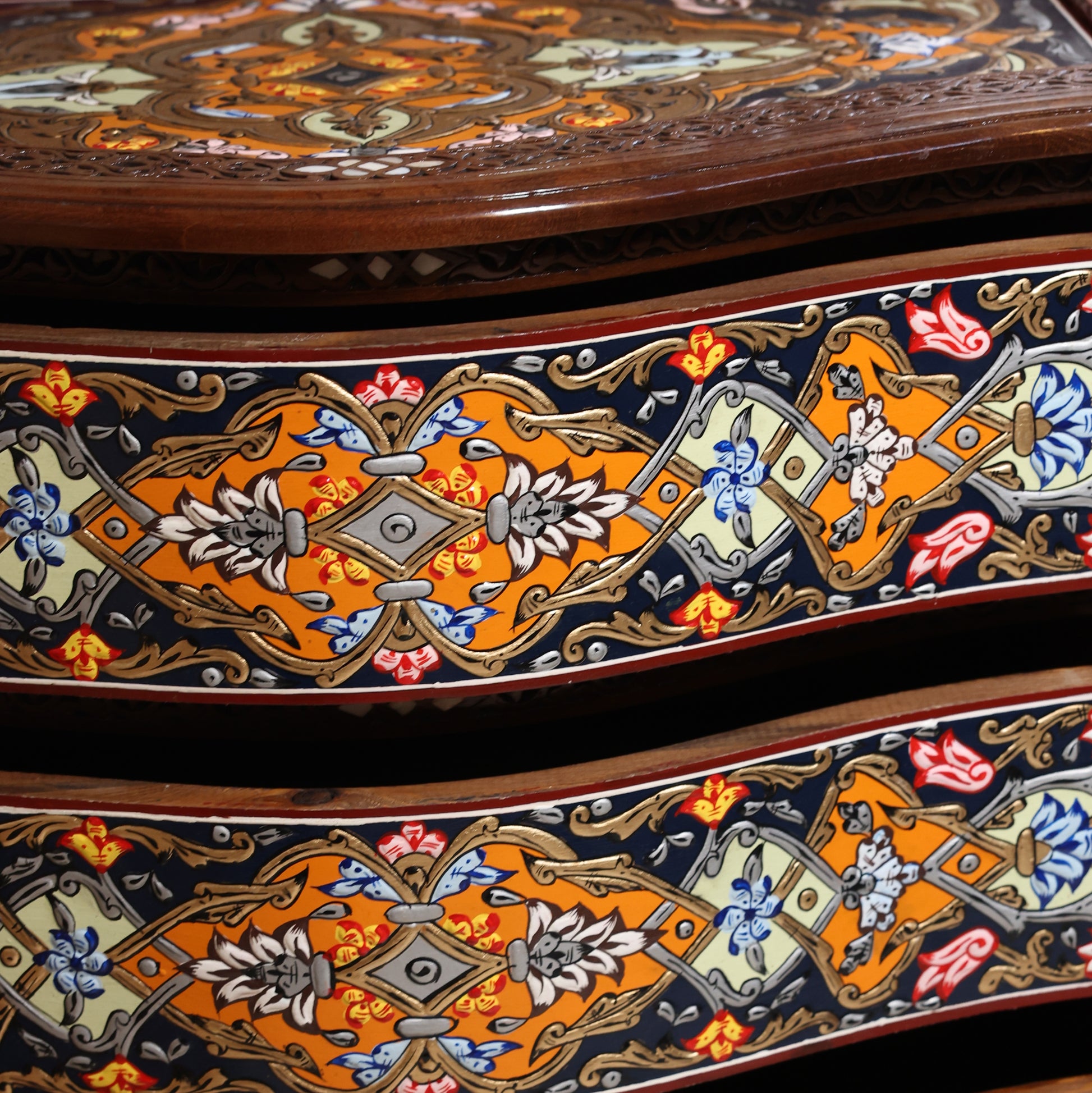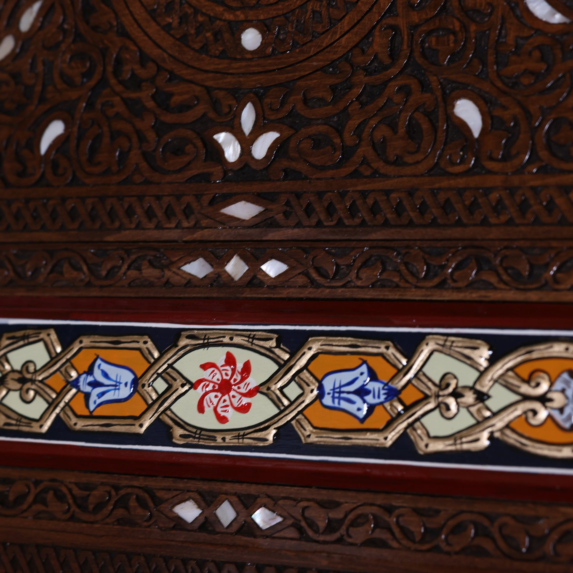 كل سطح يروي قصة - من اللمسات الفنية الدقيقة على ألواحه إلى ترصيعات عرق اللؤلؤ المضيئة - مما يجعل هذه القطعة أكثر من مجرد قطعة أثاث: إنها تعبير عن الثقافة والجمال والرقي. مثالية للديكورات الداخلية التي تتطلب الأناقة، حيث تمزج بين التراث والحضور، مجسدةً روح القصور القديمة.