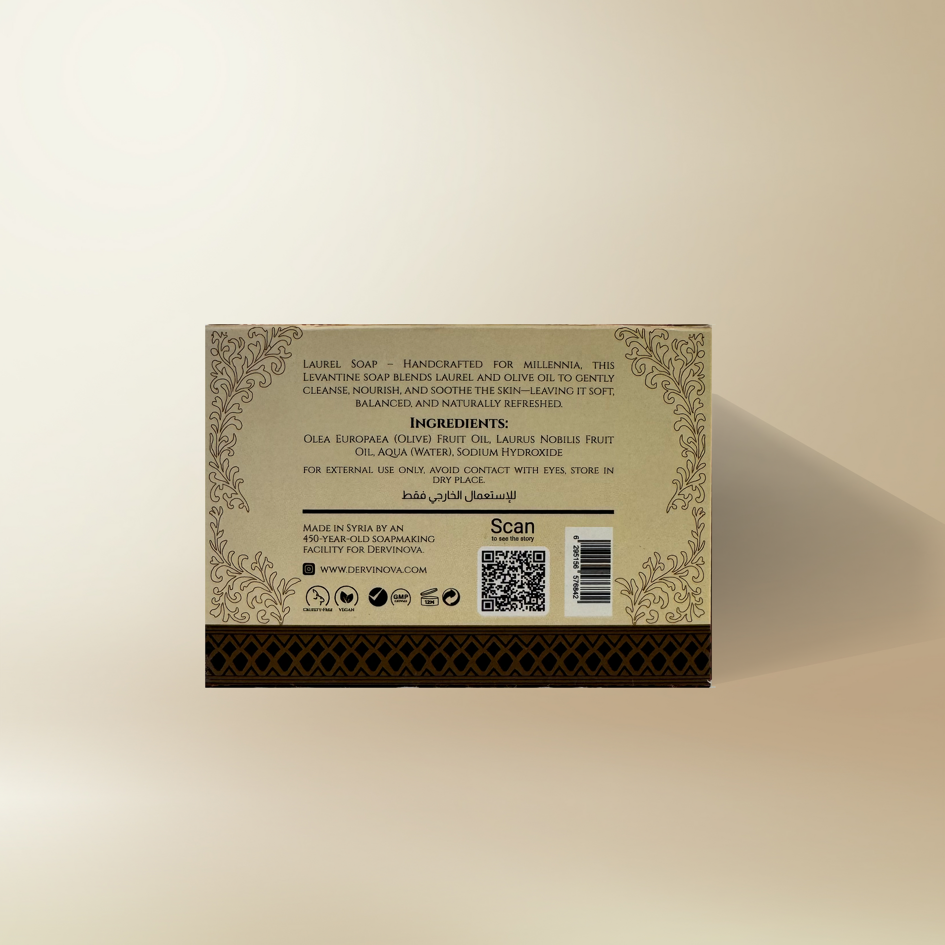 Rooted in Aleppo’s thousand-year-old art, this traditional soap embodies the original balance between purity and strength. Its warm, woody scent and rich lather carry the memory of hammams, caravans, and artisans who perfected this craft under the arches of the old city.