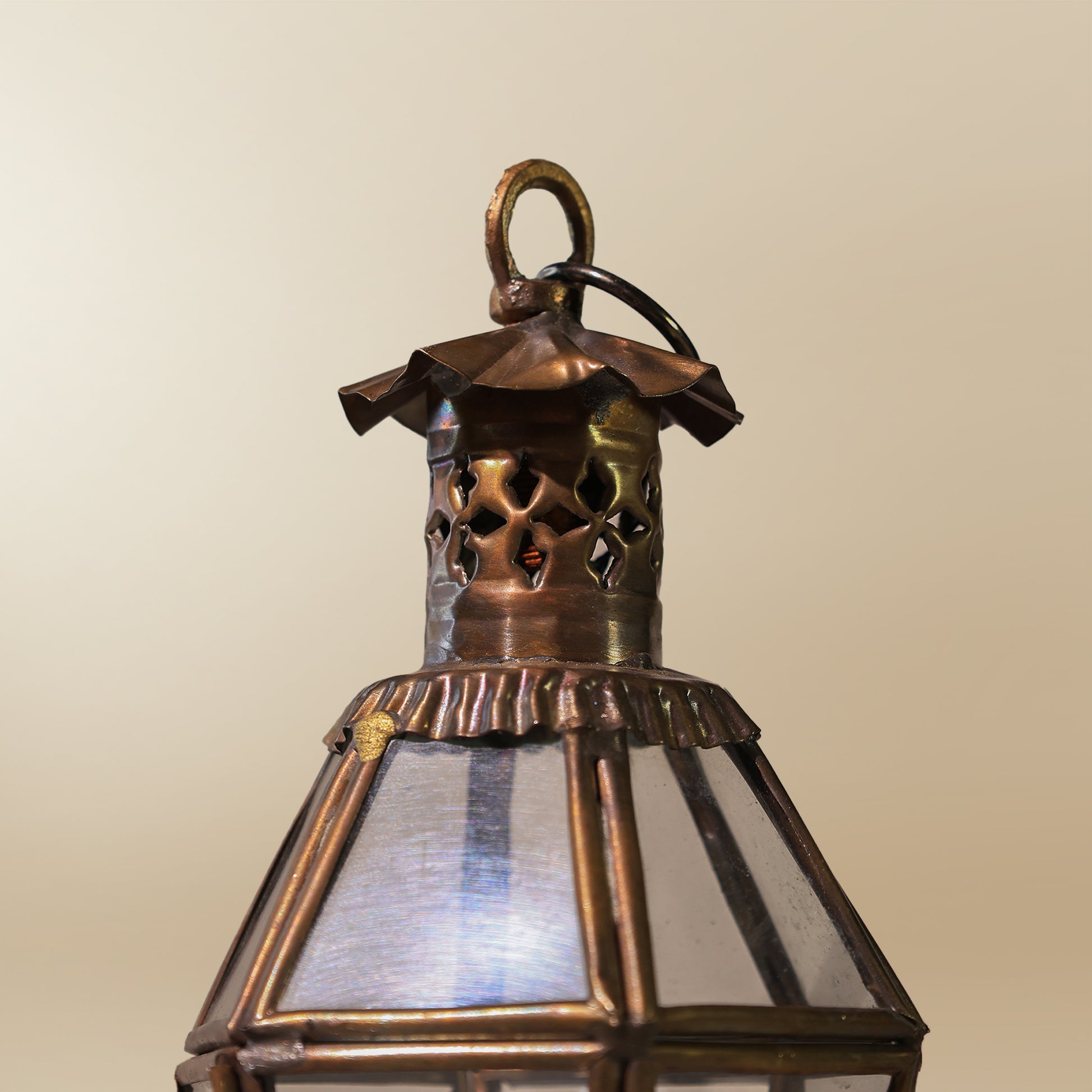 Handcrafted in copper with clear glass panels, the Andalus Lantern embodies the elegance of timeless Middle Eastern design. Its geometric silhouette recalls the architectural harmony of old souqs and Andalusian courtyards, while the warm copper frame reflects light with subtle sophistication. Whether placed on a villa terrace, illuminating a hotel corridor, or accenting your living room, this lantern turns every setting into a story of heritage and refinement.