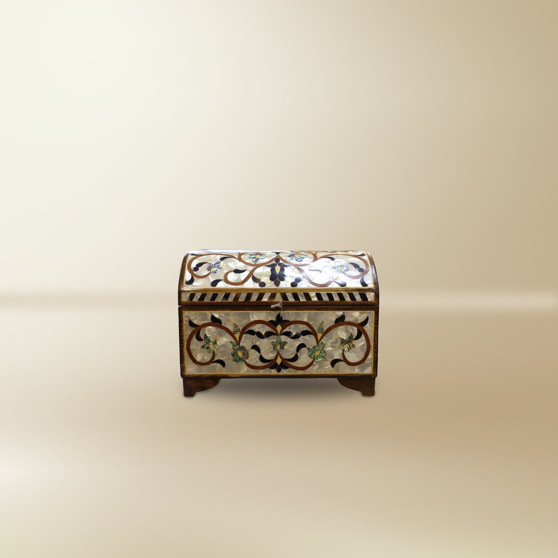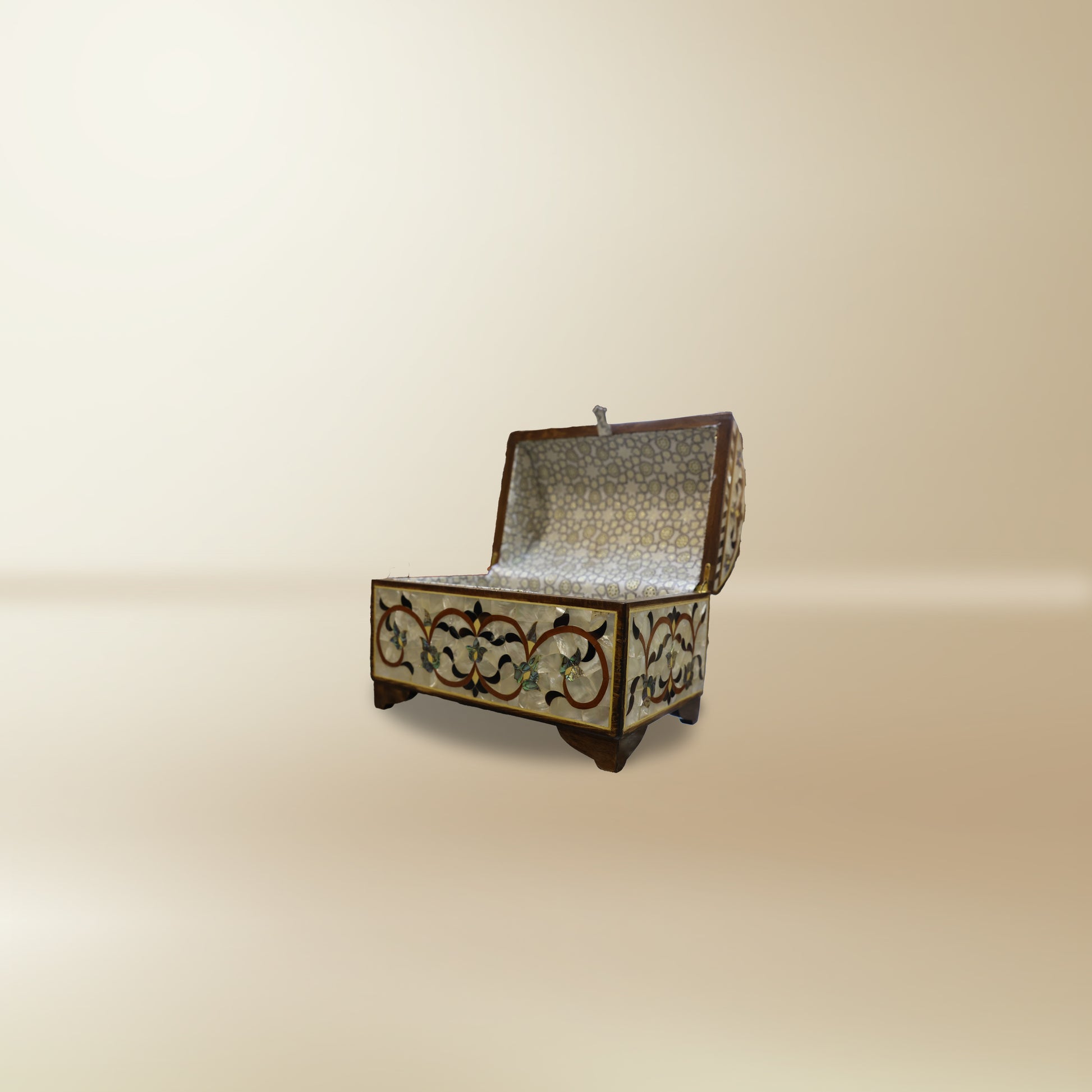 Handcrafted with mother-of-pearl inlay, this chest embodies timeless Levantine artistry. Its domed lid and vine motifs shimmer with iridescent detail, while the rich wooden body reflects warmth and heritage. Perfect for storing keepsakes or as a statement décor piece, it marries utility with elegance.