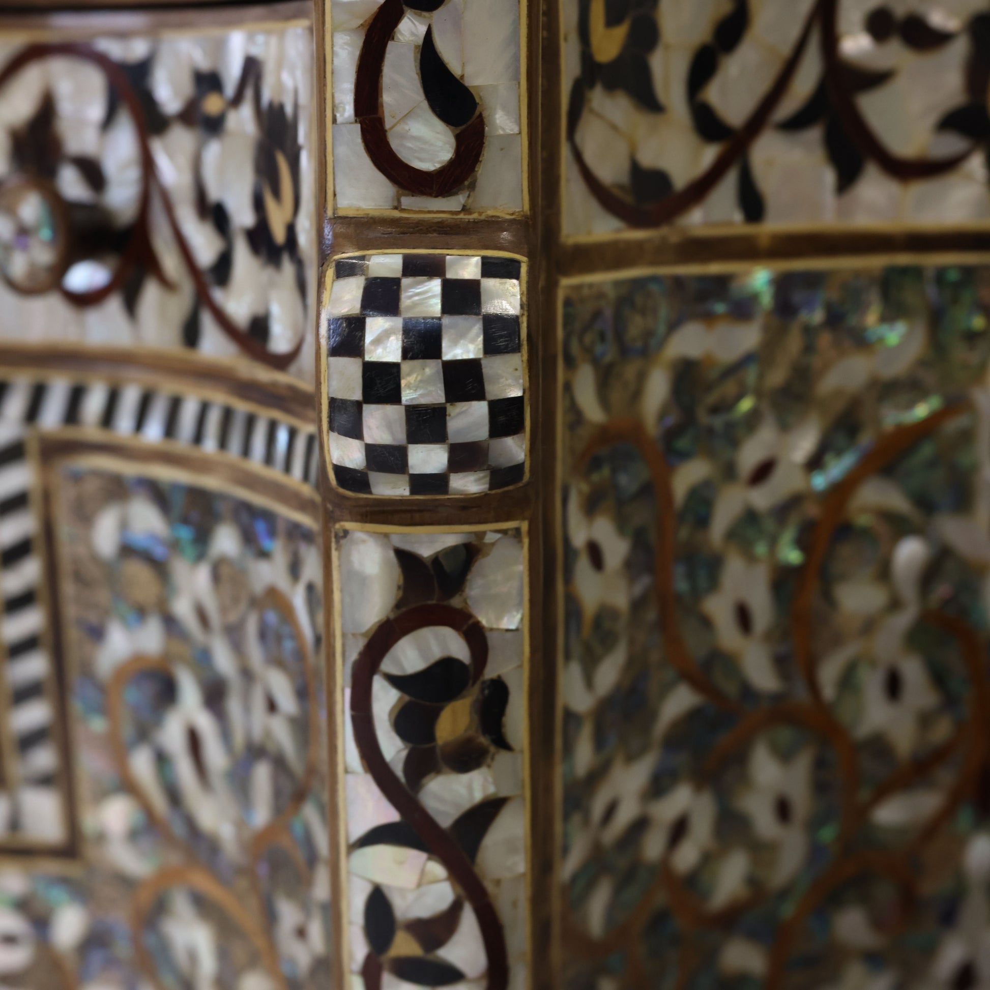 The Sultana Console with Mirror is a majestic Damascene creation, crafted to embody grace and grandeur. Hand-inlaid with shimmering mother-of-pearl and abalone on walnut wood, its intricate floral and geometric patterns radiate refinement and timeless artistry.