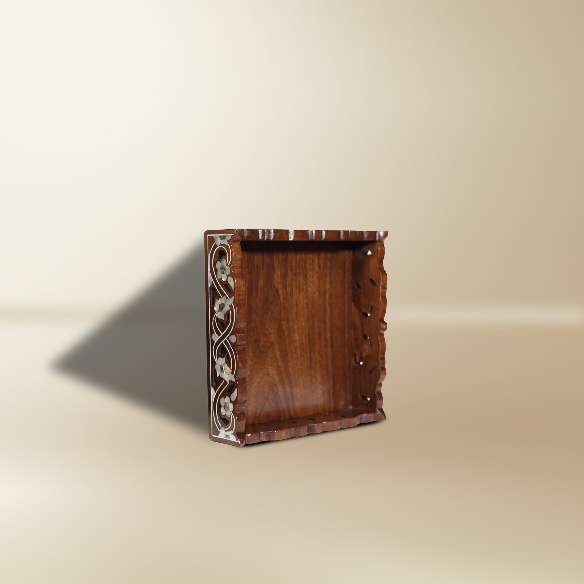 The Tray of Blossoming Inlay is a delicate Damascene piece, hand-carved from walnut wood and adorned with shimmering mother-of-pearl. Its floral motifs flow across the edges like vines, giving the tray both grace and timeless beauty.